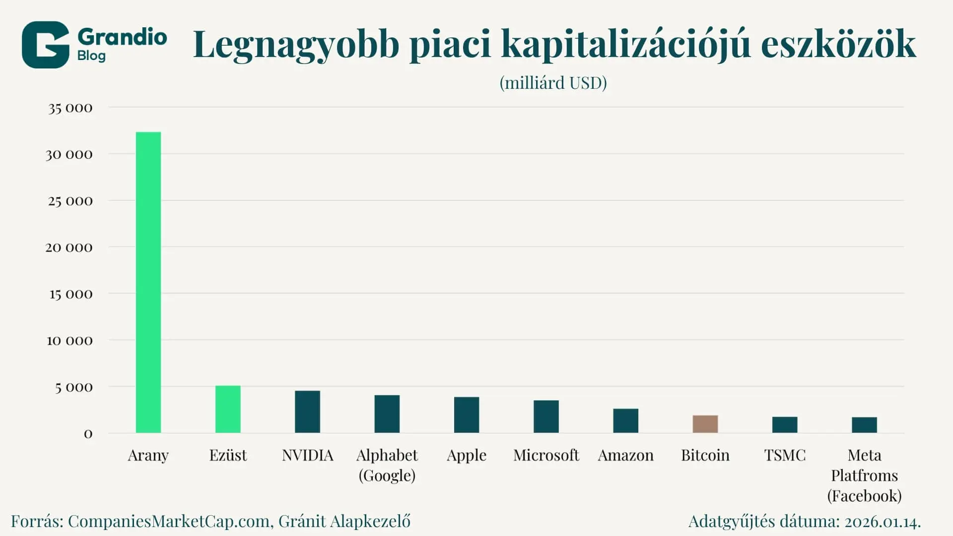 Egyértelműen az arany a legnagyobb piaci kapitalizációjú nemesfém, az ezüst csupán távoli második helyezett. Az arany azonban nemcsak a nemesfémek közül emelkedik ki, hanem szinte minden befektetési eszköz közül: 30 ezermilliárd dollár fölötti piaci kapitalizációjával köröket ver a legnagyobb értékű vállalat, a 4,5 ezermilliárd dolláros kapitalizációjú NVIDIA-ra. Az ezüst az összes eszköz között a második helyen áll 5 ezermilliárd dolláros kapitalizációval, a platina és a palládium pedig a „távoli” 24., illetve 50. helyen állnak, nagyjából 600, illetve 335 milliárd dolláros piaci mérettel.