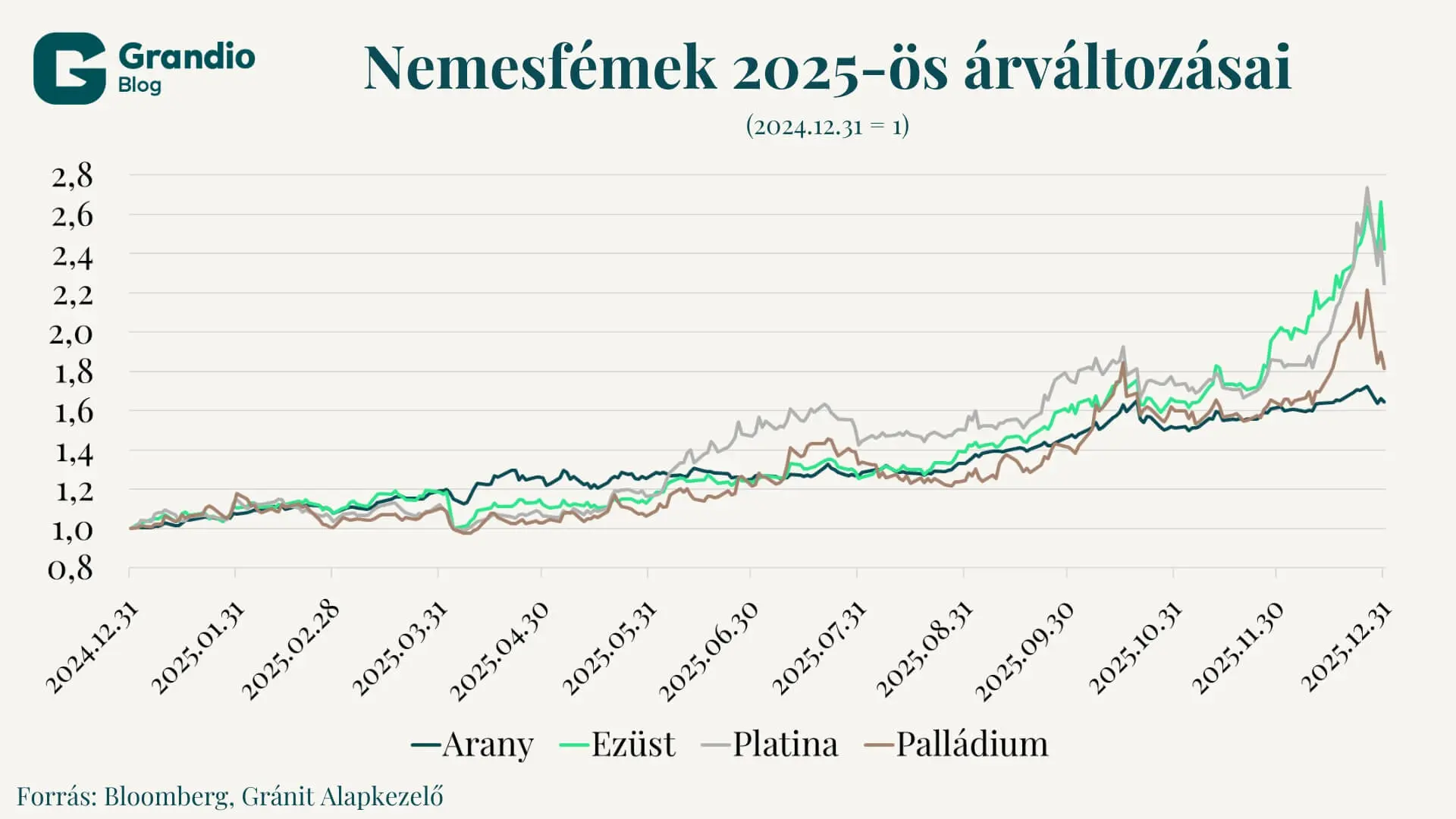 Visszatérve a nemesfémek piacára: nem véletlen, hogy ilyen előkelő helyen állnak a befektetési eszközök ranglistáján. Az arany természetesen a tavalyi robbanásszerű növekedés előtt is az első helyen állt, az ezüst, a platina és a palládium azonban nagyot lépett előre: 2025 január elején az ezüst még csak a kilencedik, a platina csak az 51., a palládium pedig a 96. helyen állt. Ez az előrelépés a tavalyi, igen komoly áremelkedésüknek köszönhető.