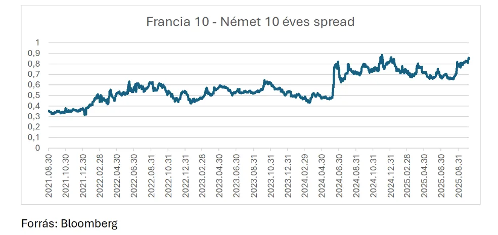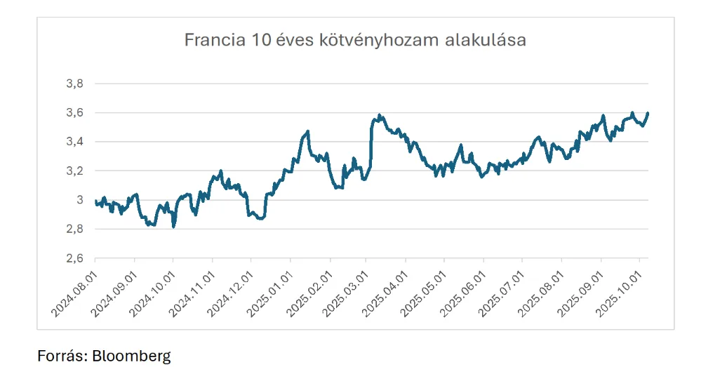 Október 13-án a tízéves francia állampapír hozama 3,47 százalék körül alakult, a tízéves német kötvényé pedig 2,63 százalék volt. A kettő közötti hozamkülönbség így mintegy 84 bázispont. Az olasz tízéves hozam gyakorlatilag megegyezett a franciával, körülbelül 3,48 százalékkal. Az elmúlt hetekben több alkalommal is eltűnt a francia felár Olaszországhoz képest, sőt volt, amikor a francia hozam magasabbra emelkedett. A múlt héten a német–francia különbség 88–90 bázispont közelébe tágult.