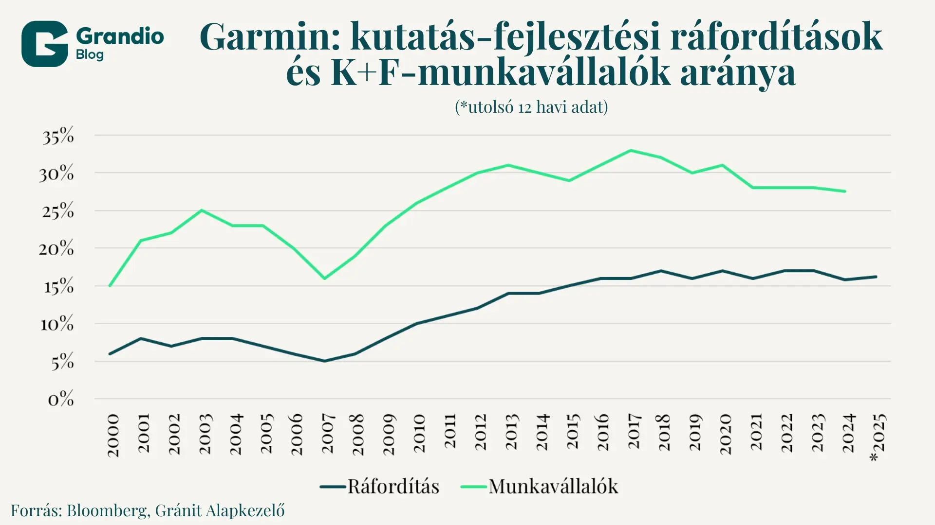 Egy vállalat, amely egyszer már átélte, hogy vezető termékének piaca gyakorlatilag megszűnik, általában megtanulja, hogy nem szabad mindent egy lapra feltenni. A Garmin pontosan ezt tette: folyamatosan kereste az új lehetőségeket, és közben látványosan felpörgette a kutatás-fejlesztési ráfordításait.