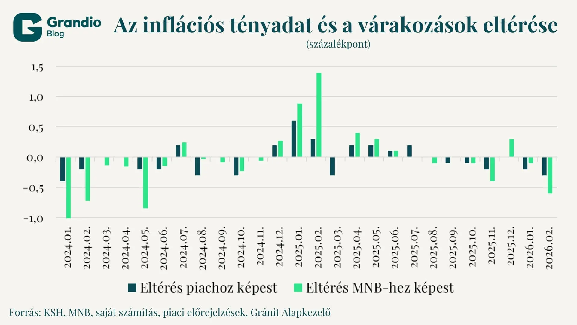 Persze inflációs előrejelzéseket nemcsak piaci elemzők készítenek, hanem a jegybank is. A kettő közötti eltérésnek megvannak a jól meghatározott okai. Ami a jegybanki előrejelzések mellett szólhat, az az, hogy sokkal nagyobb stábbal és jóval szélesebb információbázison készülnek. A jegybank viszont inflációs prognózisát csak negyedévente vizsgálja felül, az új Inflációs Jelentés megjelenésekor. Ez minden hárommal osztható sorszámú hónapban történik, azaz az ezt megelőző hónapokra vonatkozó előrejelzés hibájában összegyűlik az előző két előrejelzés hibája, vagyis az eltérés a tényadattól, így ez az előrejelzés már pontatlanabb lehet. Ilyen volt például a 2025. februári előrejelzés, ahol a piaci előrejelzők eltérése 0,3 százalékpont volt, a jegybanké viszont 1,4 százalékpont. Ebből ugyanakkor sokat magyaráz a januári inflációs adat kellemetlen meglepetése. Ezzel szemben a piaci elemzők hónapról hónapra tudják alakítani a várakozásaikat a bejövő adatok és információk fényében, tehát ez a torzító hatás nem jelenik meg. A két tévedés ugyanakkor szorosan együtt mozog, a kettő közötti korreláció 0,79, ami erős kapcsolatot jelent. Ez ismét arra utal, hogy az eltérések nem szisztematikus hibát jelentenek, inkább a bejövő adatokban van meglepetés, valami olyan, amivel kevéssé lehet számolni.