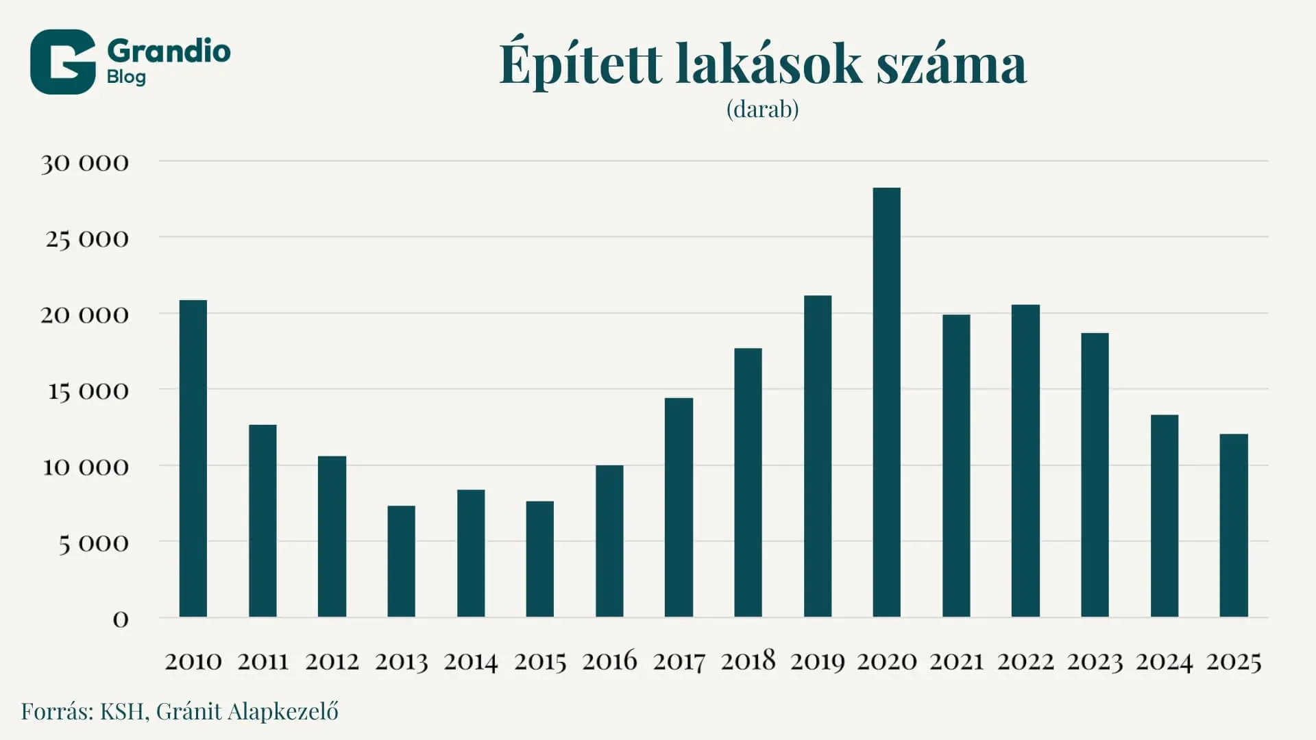 A kevés új lakást jól mutatják a 2025-ös adatok. A tavalyi évben az épített új lakások száma újabb csökkenést mutatott: mindössze 12 062 új lakás épült, az előző évinél 9,3 százalékkal kevesebb. Ha csak a negyedik negyedéves adatokat nézzük, akkor már nem történt további csökkenés, a lakásépítések száma stagnált. A mostani szintről azonban jelentős pozitív irányú elmozdulásra lenne szükség ahhoz, hogy elérjük a kívánatos szintet, azaz hogy évente 30–40 ezer új lakás épüljön hazánkban.