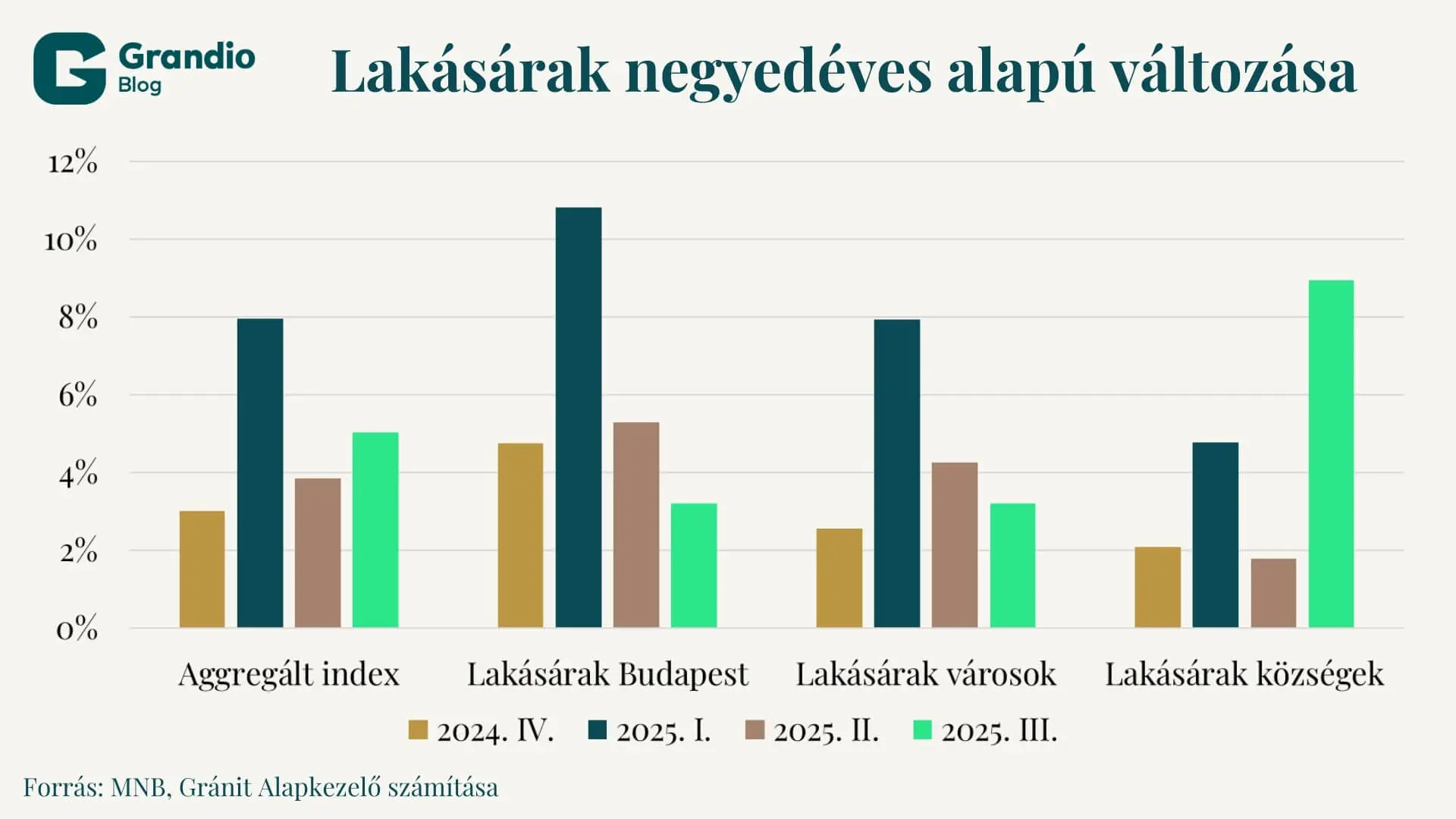 Az egyes településtípusok között nem látszik érdemi különbség abban a tekintetben, hogy 2015 óta hogy változtak az árak: a fővárosban 4,29-szeresére, a városokban 4,23-szorosára, míg a községekben 3,51-szeresére nőttek az árak – az utóbbi területen volt tehát a legkisebb a drágulás, a legkisebb a kereslet. 2024-ben azonban már a községekben drágultak legjobban a lakások: 19,0 százalékkal, ezt követték a városok 12,4 és a főváros 11,1 százalékkal. Ebben vélhetően szerepe lehetett a vidéki alacsonyabb bázisnak, illetve a falusi CSOK-nak mint megmaradt lakástámogatási formának.