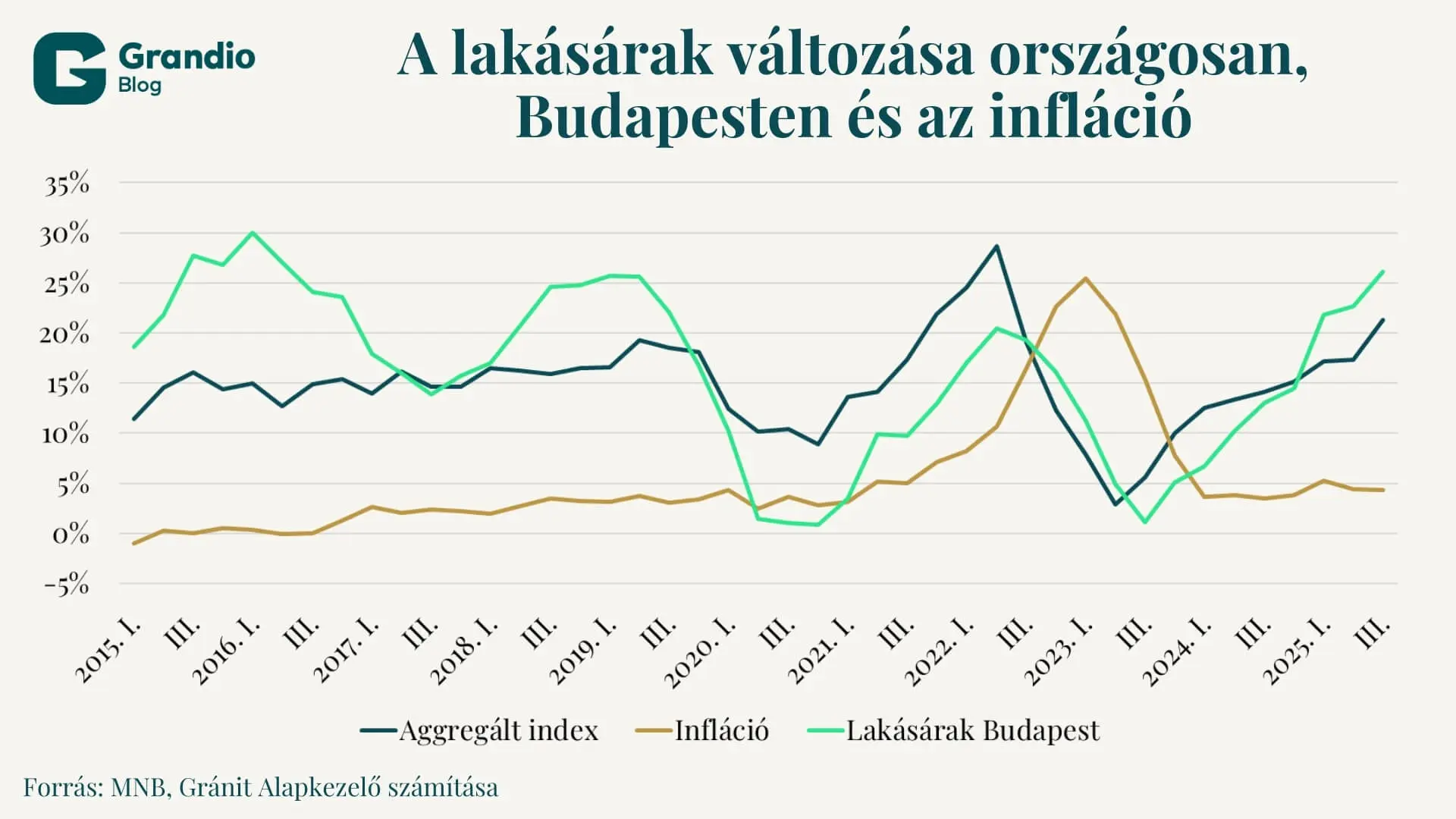 A 2024-es évet már egy újabb, szemmel is jól látható drágulás jellemezte: az árak átlagosan 13,8 százalékkal lettek magasabbak, miközben az infláció 3,7 százalék volt. 2025-ben aztán az árak még jobban megindultak: az első negyedévben 17,2, a másodikban 17,3, míg a harmadikban 21,3 százalékkal emelkedtek az árak. Ebből már látható, hogy az áremelkedés nem az Otthon Starttal kezdődött, de persze az sem hatott fékezőleg. Az első félév jelentős drágulását szintén egy keresleti sokk okozta: a prémium állampapírok hozama az alacsonyabb infláció miatt csökkent, így befektetéseiknek sokan az ingatlanpiacon kerestek helyet. Ez azt jelenti, hogy országosan az első negyedévben 8,0 százalékos drágulást a második negyedévben 3,8, majd a harmadik negyedévben 5,0 százalékos áremelkedés követte.