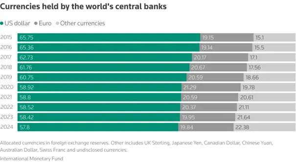 A globális jegybanki tartalékok értéke a 2008-as válság óta dinamikusan emelkedett, ezért egy sokkal nagyobb rész 58 százaléka nagyobb dollárösszeget feltételezett, mint a 20 évvel ezelőtti, alacsonyabb szintű tartalék 70 százaléka. Kijelenthető, hogy bár valóban zajlik a jegybanki tartalékok diverzifikációja, a dollár nominális összege a jegybanki páncélszekrényekben folyamatosan emelkedett.