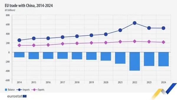Elemzők szerint az Európából érkező egy konténerrel szemben négy kínai konténer indul meg az európai kontinens felé. A külkereskedelmi egyensúlytalanság természetesen hosszú távon nem fenntartható. Az ábrán jól látható, hogy az elmúlt tíz évben az EU-országok kivitele alig emelkedett, a Kínából származó behozatal viszont megháromszorozódott, így a kereskedelmi deficit összege meghaladja a 300 milliárd eurót.