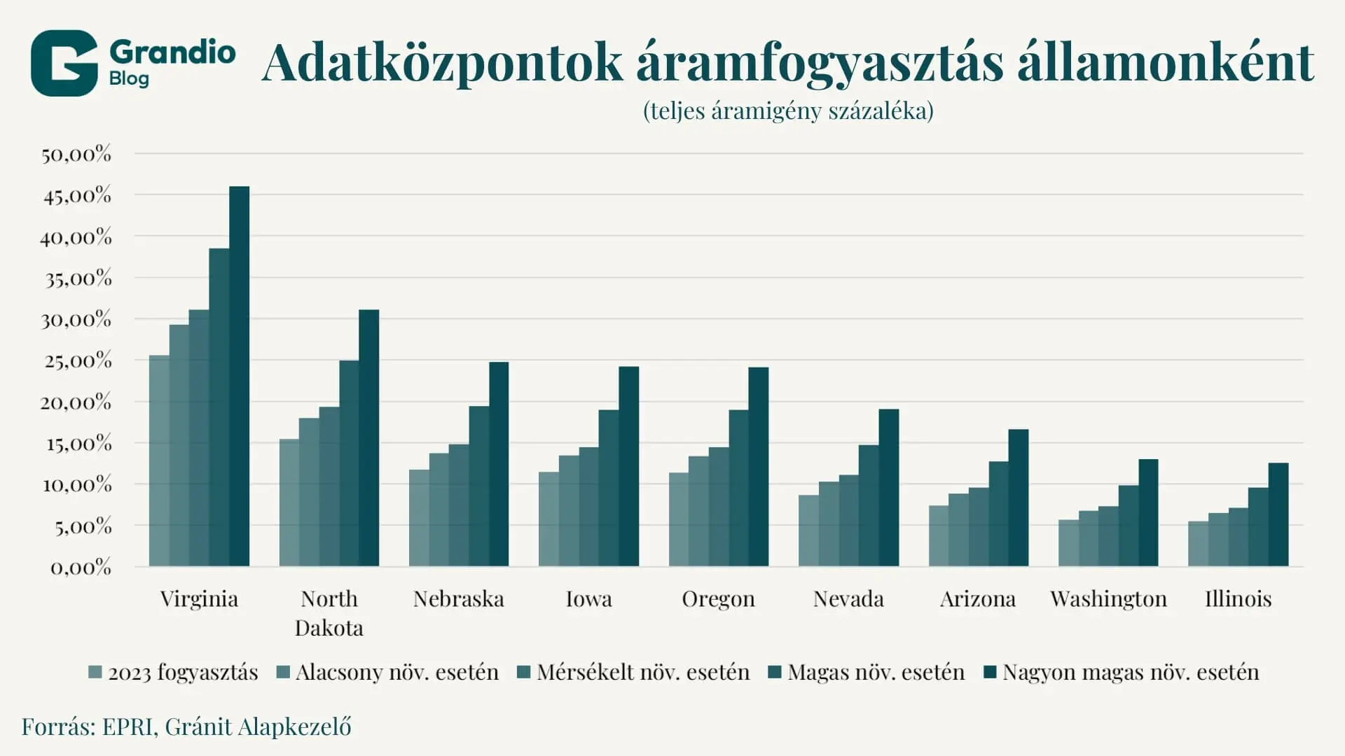 Az Egyesült Államok példáján láthatjuk ezt talán a legjobban a valóságban. A Pew Research Center összefoglalója szerint 2023-ban Virginia államban az adatközpontok a teljes áramigény körülbelül 26 százalékát tették ki, és több más államban is két számjegyű százalékokat mértek.